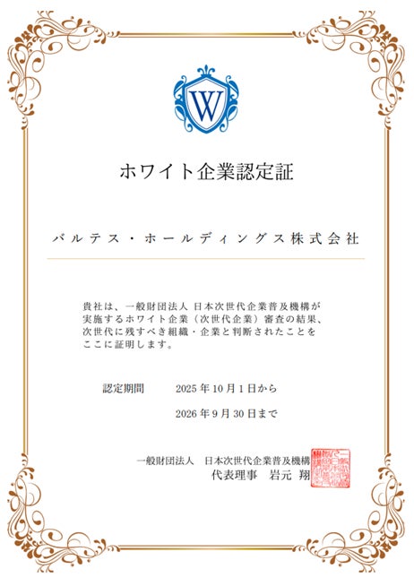 バルテス・ホールディングス株式会社(本社:大阪市西区、東京都千代田区、代表取締役会長 兼 社長:田中真史、以下、バルテス・ホールディングス)は、2025年度も一般財団法人 日本次世代企業普及機構(以下、ホワイト財団)より「ホワイト企業認定」のプラチナランクを取得いたしました。「ホワイト企業認定」の取得は5年連続、プラチナランクの取得は3年連続です。