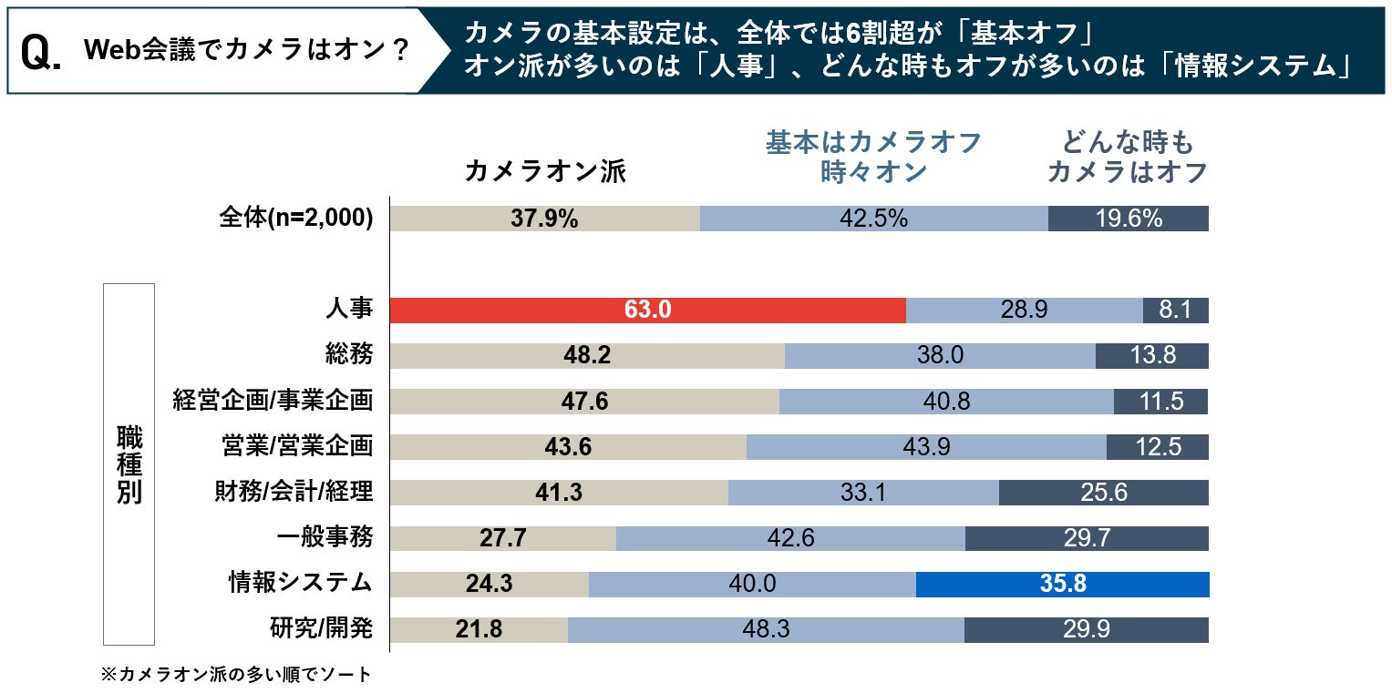・Web会議で「カメラオン派」が多い職種1位は「人事」で、63.0%が基本的にカメラオン