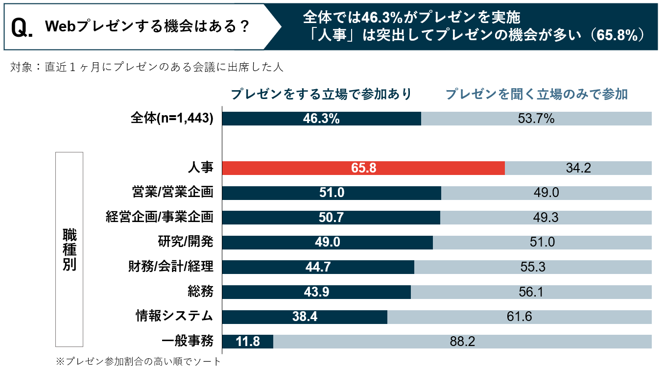 直近1ヶ月にプレゼンのある会議に出席した人に対して、自身がWebプレゼンをする機会があるか質問したところ、「人事」は65.8%の人がプレゼンをする立場で会議に参加しており、全体の46.3%と比較して、突出して多いことが判明しました。