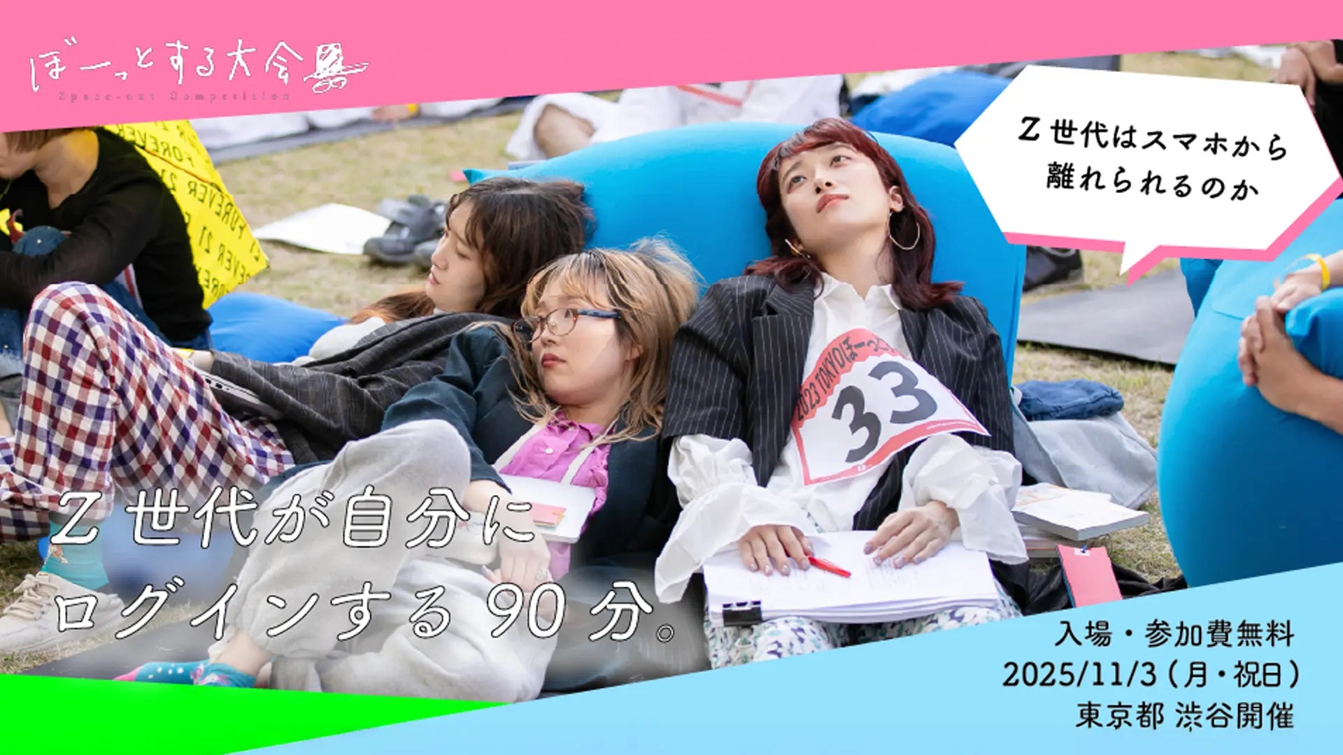 SIWの一環として、情報過多の時代に“何もしない”時間の価値を問い直すイベント「第3回 TOKYOぼーっとする大会」を、2025年11月3日(月・祝)に渋谷区立宮下公園 芝生広場で開催します。対象は10代・20代のZ世代。約150名の参加者が90分間、会話・スマホ操作など一切の行為をやめ、ただ“ぼーっとする”ことに挑みます。心拍数の変化をもとにした「技術点」と観客投票による「芸術点」で評価し、最も深く“ぼーっと”できた人を表彰します。SIWは、多様なアイデアと社会の未来をつなぐ渋谷発のソーシャルフェスティバルとして、街全体を舞台に「考える・感じる・試す」機会を提供してきました。本大会では、情報に追われる現代社会において、何もせずに立ち止まることが創造性や自己回復の原点であることを体感的に発信します。