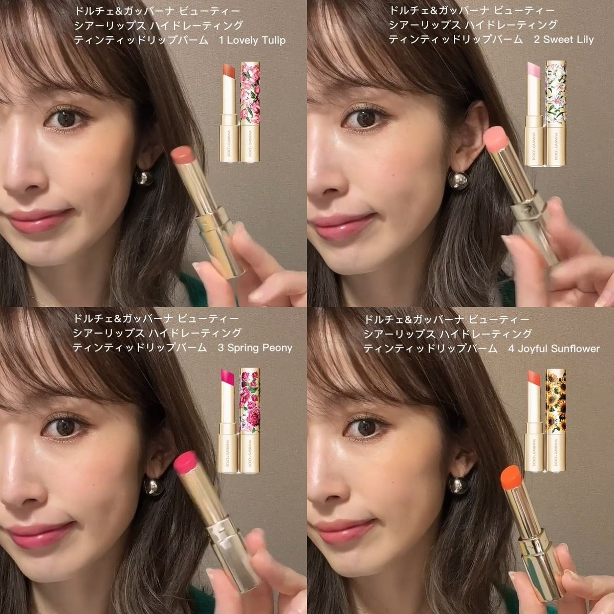 「今回の新作リップバームは、花々の名前を由来に持つカラー名で、唇にも自然に馴染むナチュラルな発色。もちろん単体でも楽しむことができるし、リップ下地としても使えたり、重ね付けにも使いやすい万能タイプかなと思います。バームなのでスルスル塗れるし唇がうるうるに。秋冬メイクで濃いカラーのリップや