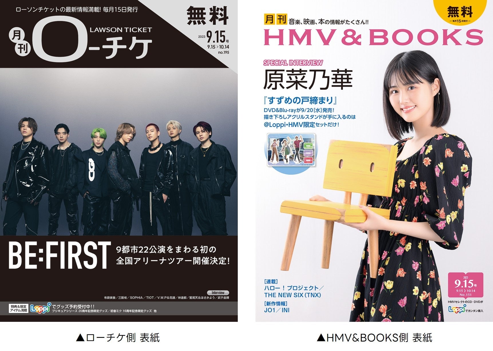 『月刊ローチケ』の表紙には、9都市22公演をまわる初の全国アリーナツアーの開催が決定した「BE:FIRST」。そして『月刊HMV&BOOKS』の表紙には、DVD&Blu-rayが9月20日(水)に発売される映画『すずめの戸締まり』より主人公・鈴芽役を務めた原菜乃華さんが登場!