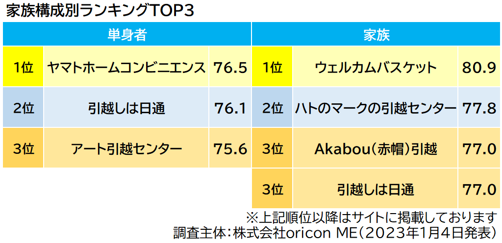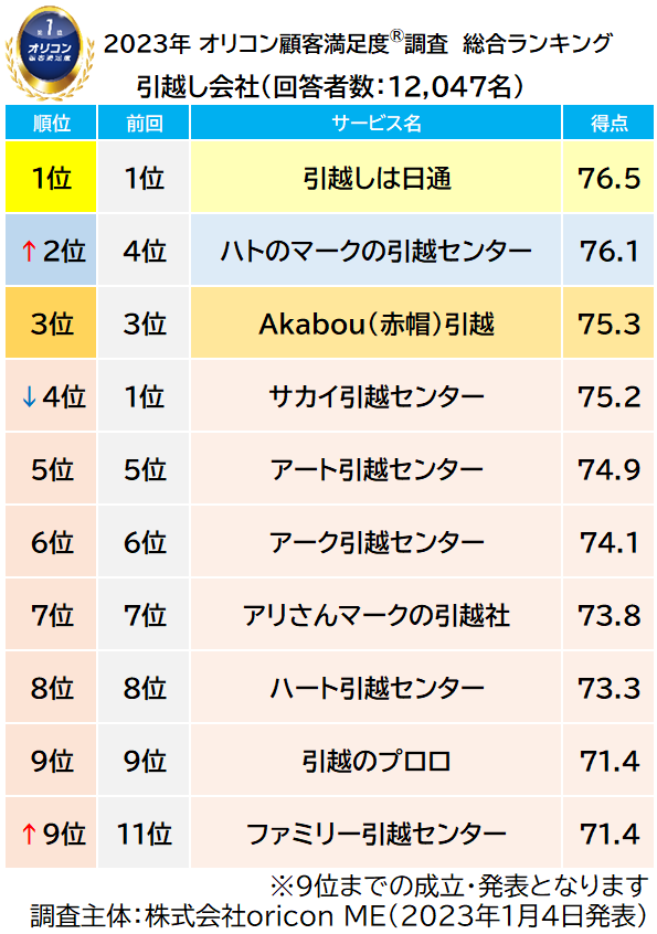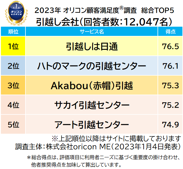 実際の利用者12,047名が評価した『引越し会社』ランキング(2023年オリコン顧客満足度®調査)