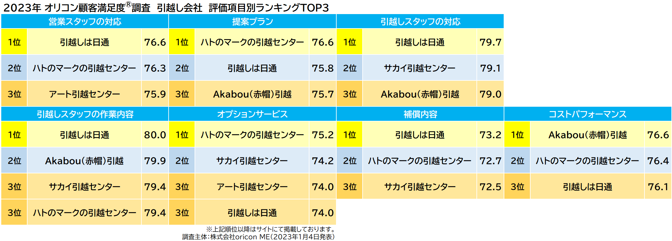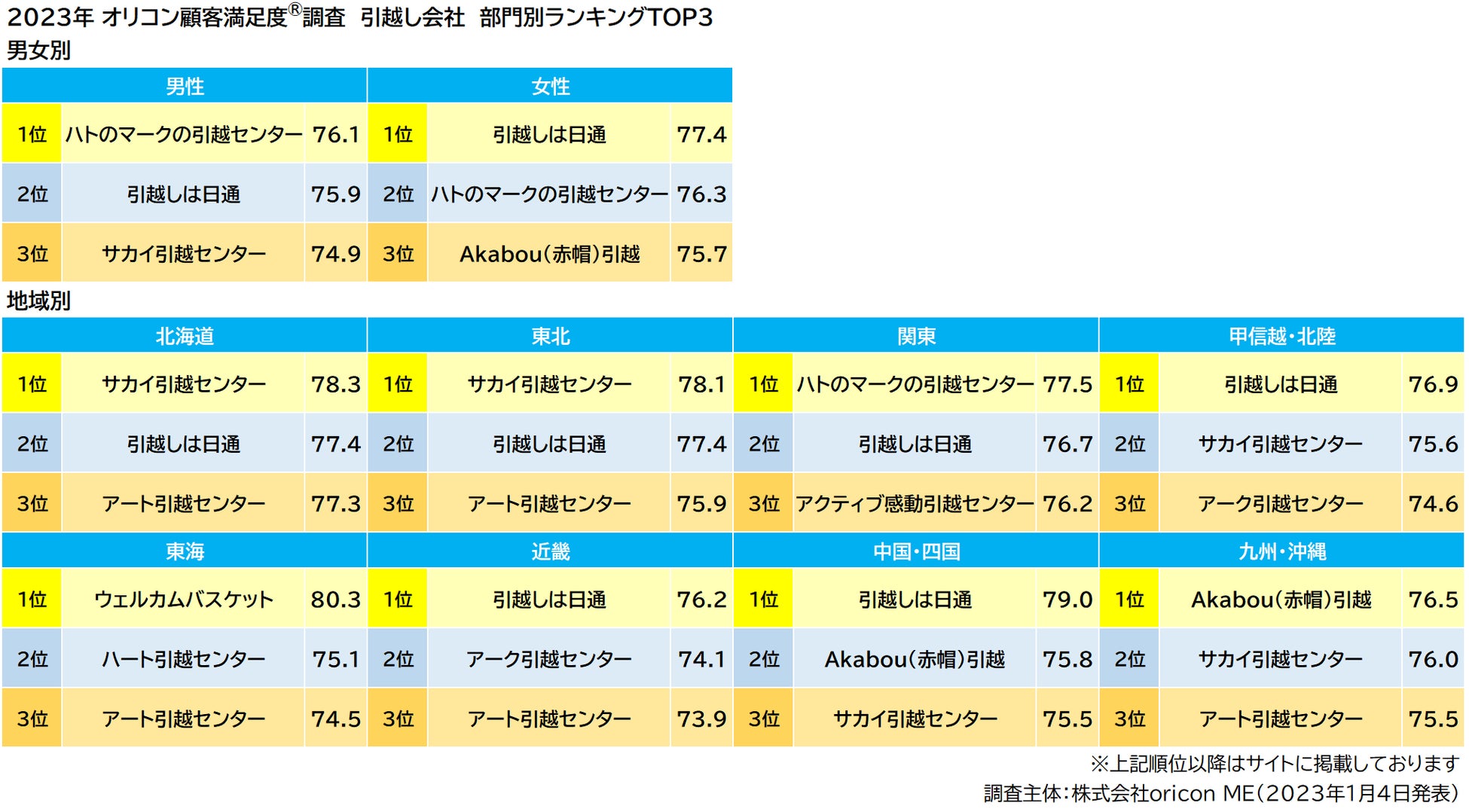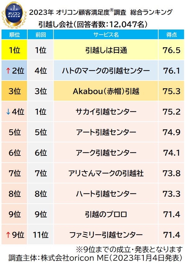 実際のサービス利用者を対象に第三者の立場で顧客満足度調査を実施する株式会社oricon ME(本社:東京都港区 代表取締役社長:小池恒 略称:オリコン)は、『引越し会社』についての満足度調査を実施し、2023年1月4日(水)14時にその結果を「オリコン顧客満足度®」公式サイト内( https://life.oricon.co.jp/ )にて発表いたしました。ランキングの結果は、下記の通りとなりました。