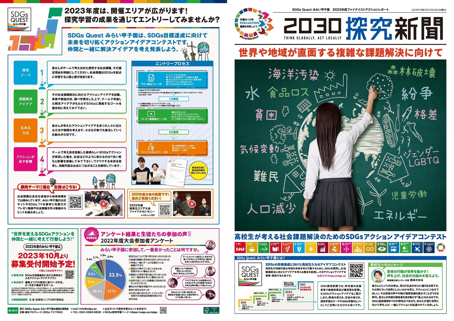 2023年度の開催エリア内の学校に向けて、みらい甲子園受賞アクション普及啓発広報媒体「2030探究新聞」を発行しています。「2030探究新聞」は、2022年度に各エリアで開催された大会の最優秀・優秀賞チームのアクションアイデアなどを紹介し、高校生たちの大会参加へのきっかけ作りやアイデア創出の参考になることを目的にしています。