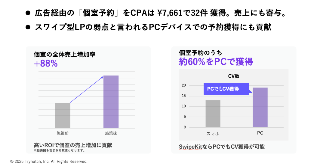 広告経由で32件の個室予約(¥60,000〜)を獲得し、売上に大きく寄与。SwipeKitの視覚的な訴求力が、高単価商材の魅力を効果的に伝えた結果です。