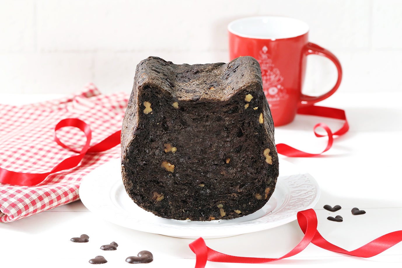 思わず "きゅん♡" となる可愛らしい見た目が特徴的な「ねこねこ食パン バレンタイン三毛猫」は、イチゴ味のチョコを混ぜたいちご風味の生地、チョコチップとクルミを混ぜたココア風味の生地、プレーン生地と、3種類の味わいを一度に味わえる贅沢なねこねこ食パンに仕上げました。