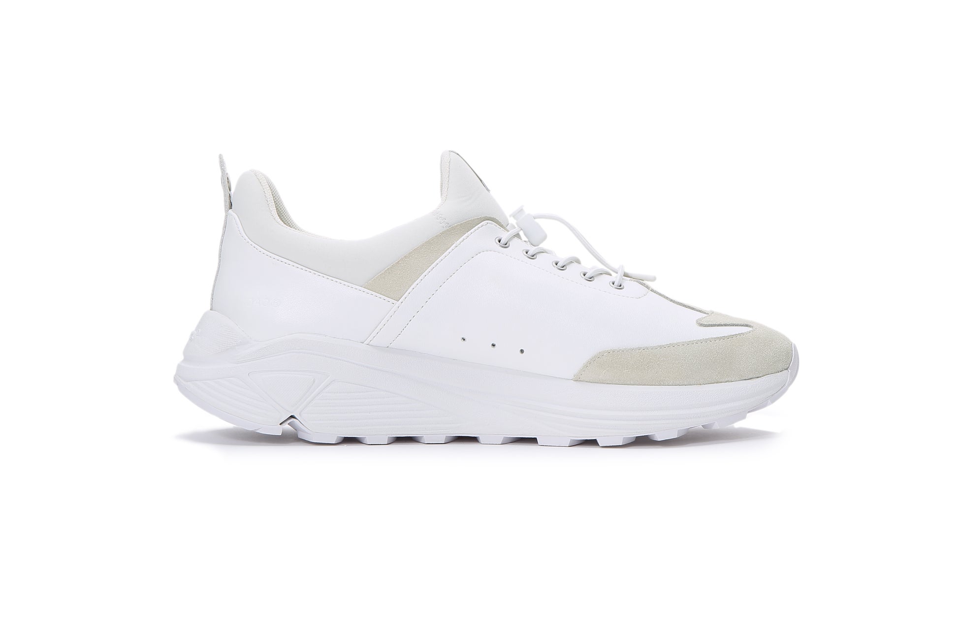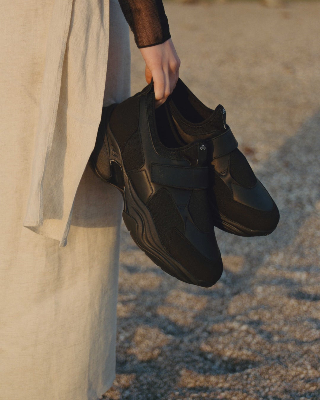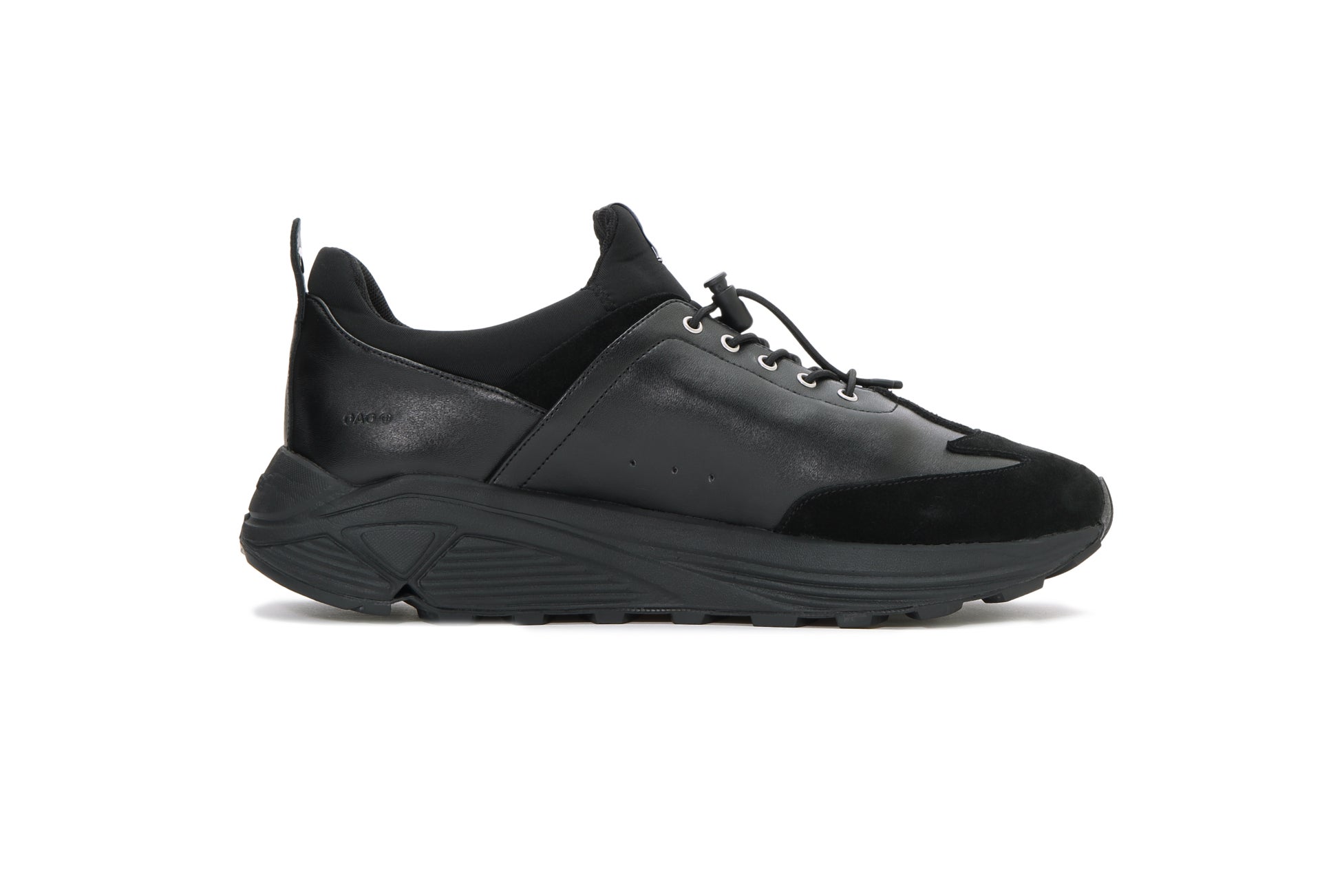 伸縮性と通気性に優れたニット素材と、光沢の美しいECCO社のサステナブルレザーを融合した1足。