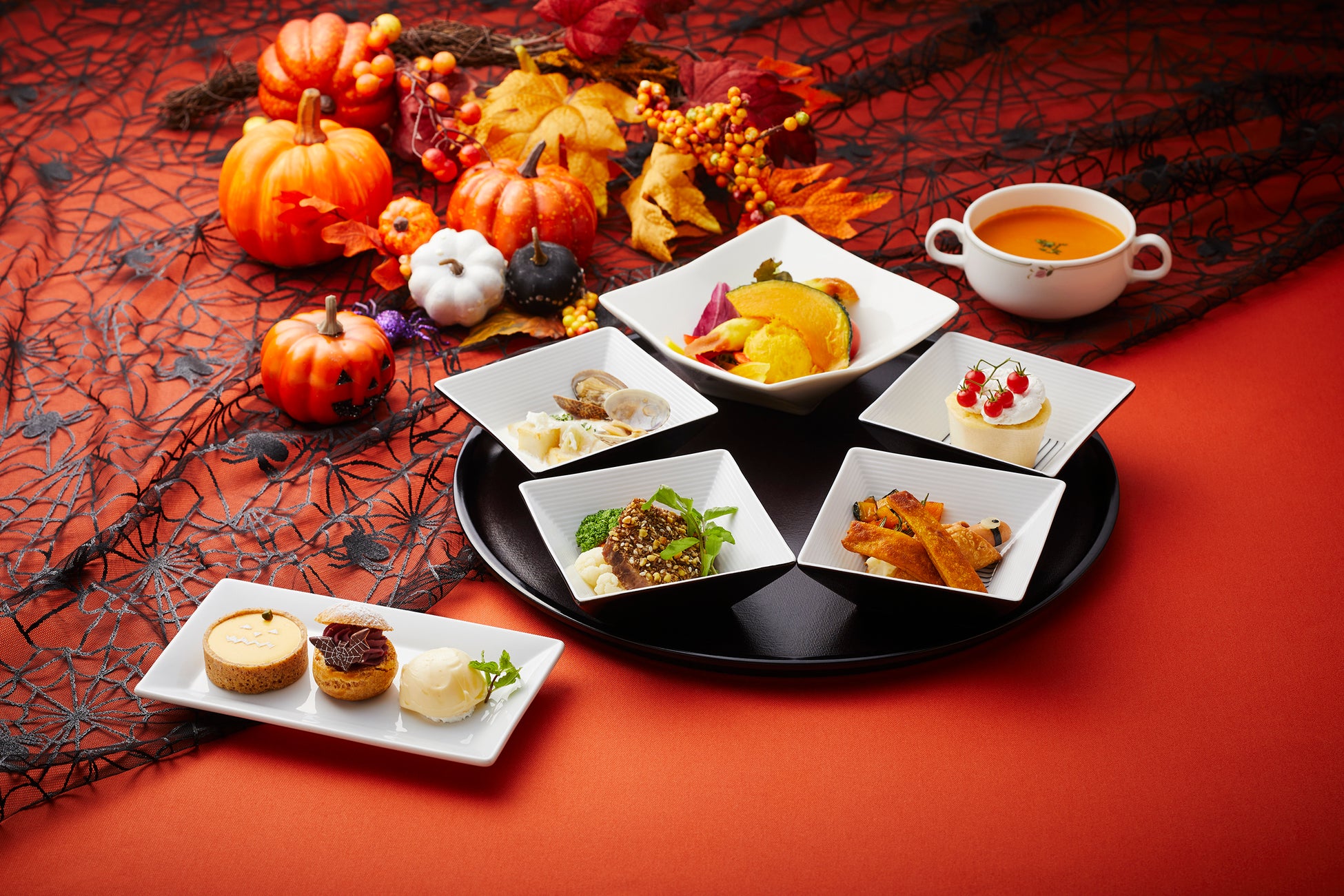 カボチャや栗など秋の味覚をふんだんに取り入れたブッフェメニューをはじめ、ローストビーフやカレー、ピラフなど幅広い世代に人気の定番メニューもご用意。デザートはブドウや栗、カボチャなどで季節感を演出しながら、おばけなどのハロウィンキャラクターでアレンジしたハロウィンムードを満喫いただけるラインナップです。