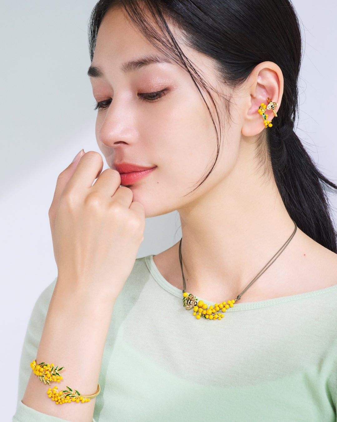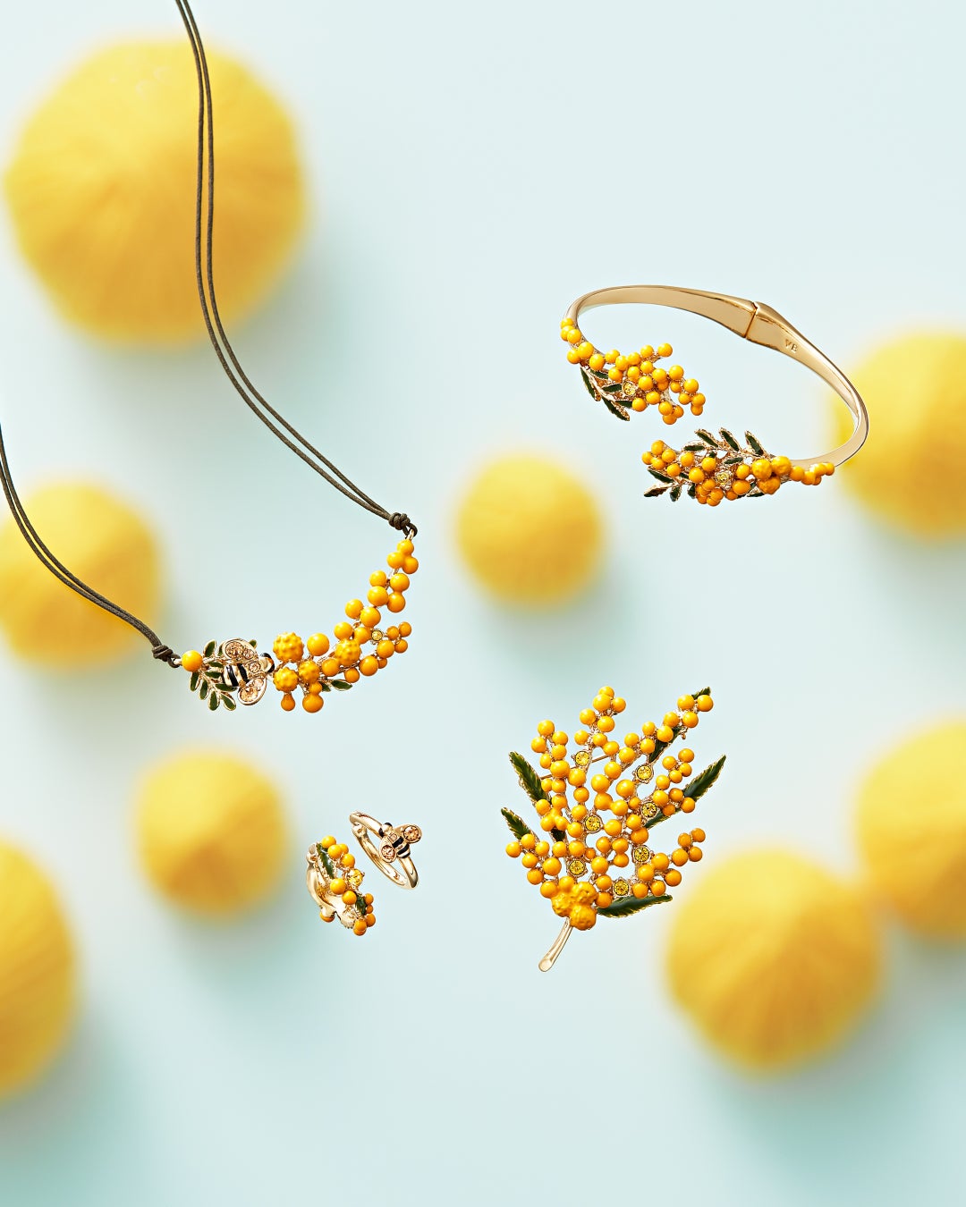 職人が一点一点丁寧に色付けをして仕上げた繊細なつくりが魅力のミモザの花。色鮮やかなアイテムは、身に着けるだけでハッピーな気持ちにしてくれます。