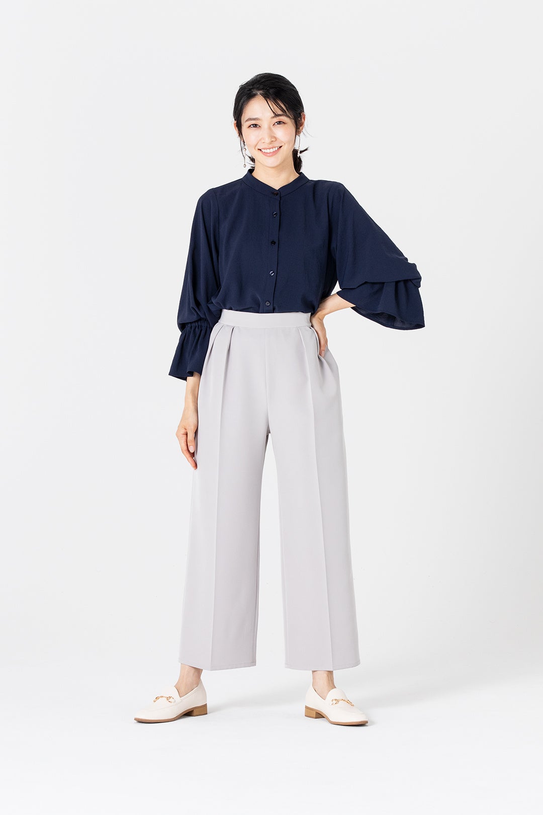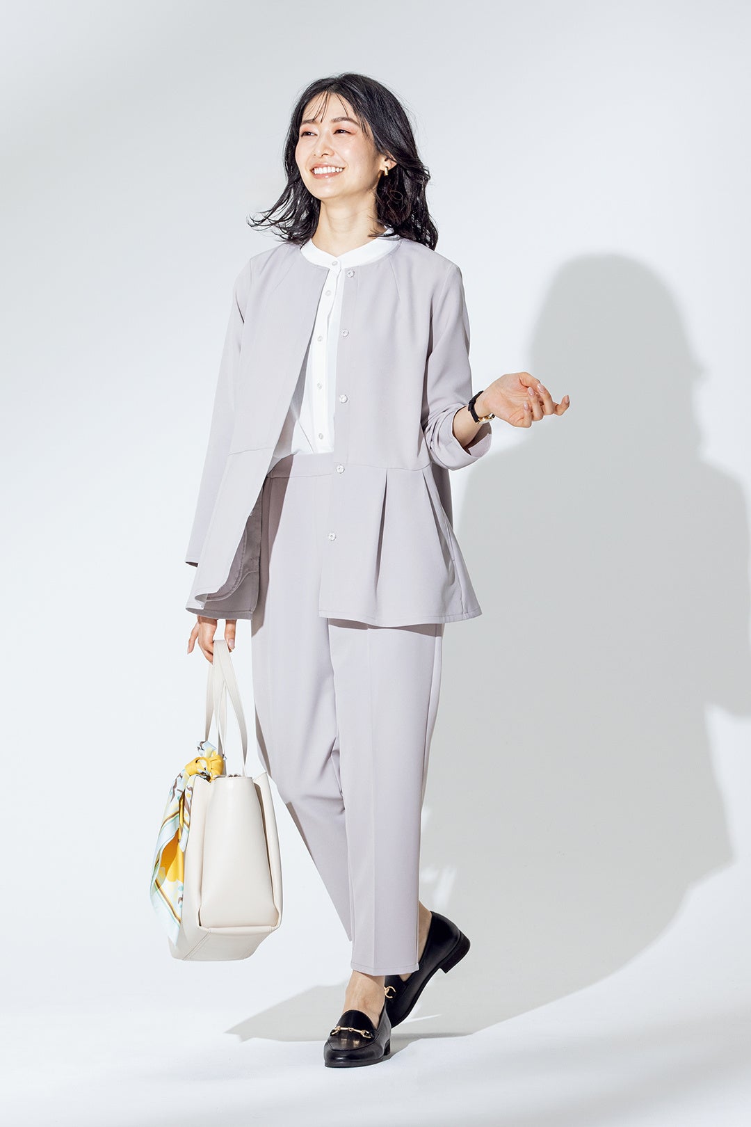 テーパードパンツにペプラムジャケットをさらっと羽織れば一気にオケージョンスタイルに。かっちり過ぎないデザインなので、オケージョンシーンだけでなく、オフィスで使うにもピッタリです。