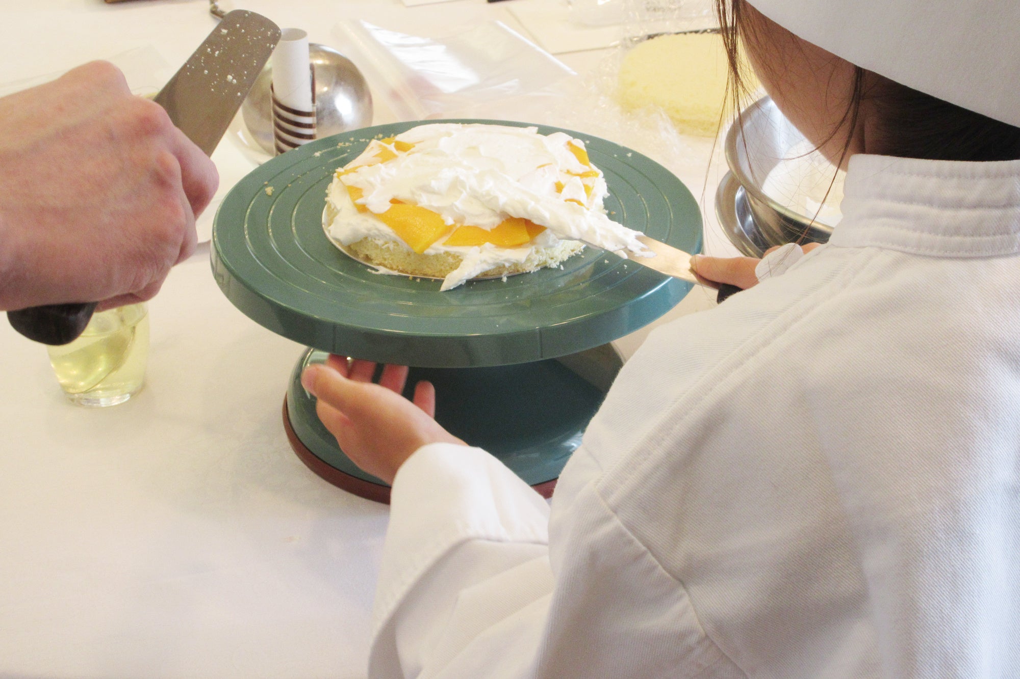 内 容:体験用ケーキ1台(直径15cm)、試食とお飲み物、お子さま用コックコート(レンタル)、コック帽、記念写真、レシピ