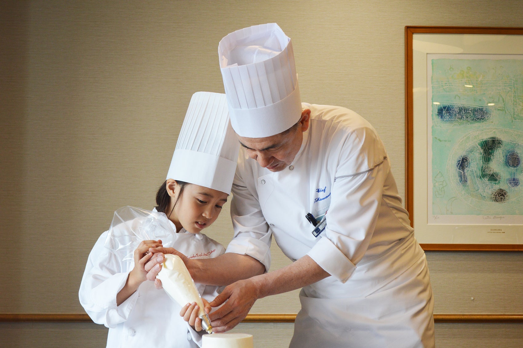 ホテルオリジナルの清潔なコックコートに身を包み、コック帽を被って身だしなみを整えると、ホテルのパティシエのデモンストレーションからスタートです。美味しく作るコツを教わった後は、パティシエが手伝いながら親子で仲良くケーキのデコレーションを体験いただきます。お子さまが自分の手で仕上げた個性豊かなケーキは、ご指定の時間に客室までお届けいたします。ご家族みんなで協力して作った“オリジナルケーキ”を味わう喜びは、お子さまの成長を感じるだけでなく、夏の思い出作りや自由研究にもおすすめです。また、宿泊せずにパティシエ体験のみのプランもございます。