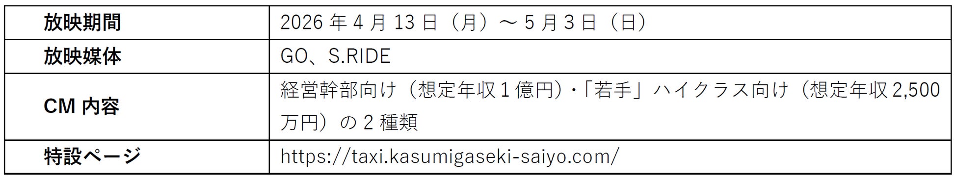 あわせて、本採用の認知拡大を目的として、2026年4月13日(月)から5月3日(日)まで、タクシーサイネージ広告( GO 、S.RIDE)にてCMの放映を開始いたします。