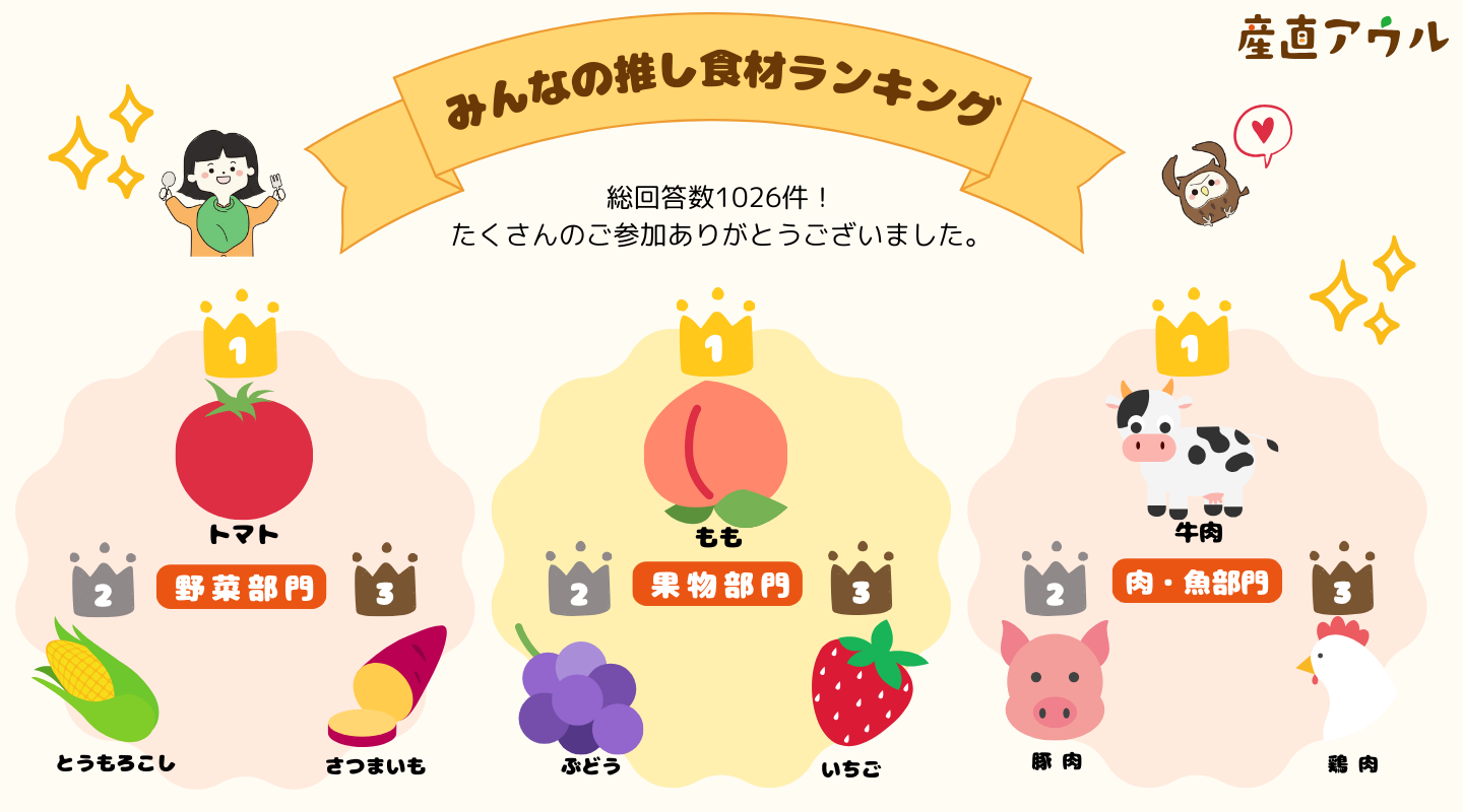 栄えある「推し」食材の第1位は野菜部門「トマト」、果物部門「もも」、肉/魚部門「牛肉」