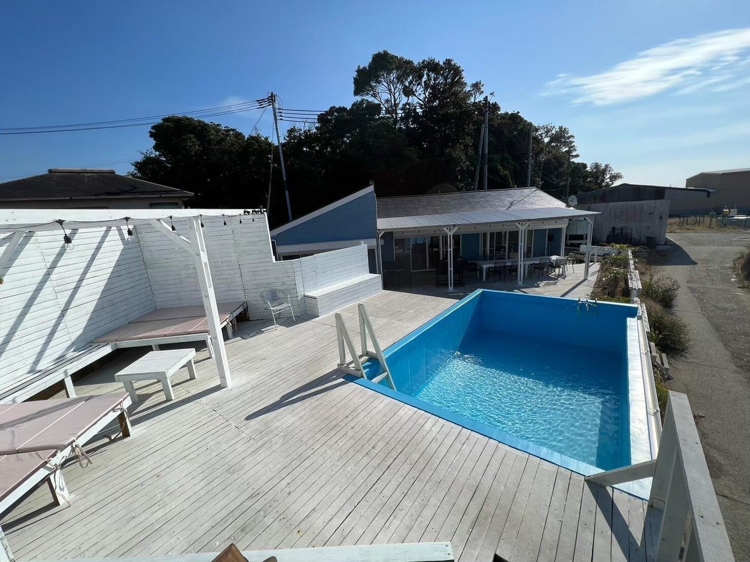 海を一望できる広いウッドデッキと、開放的なアウトドアリビングが魅力的な印南ヴィラ。