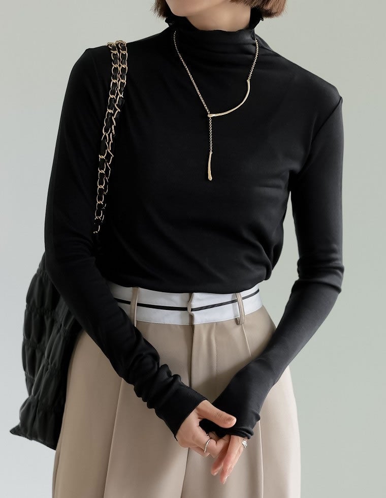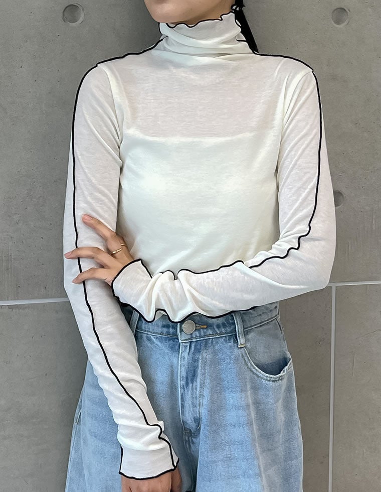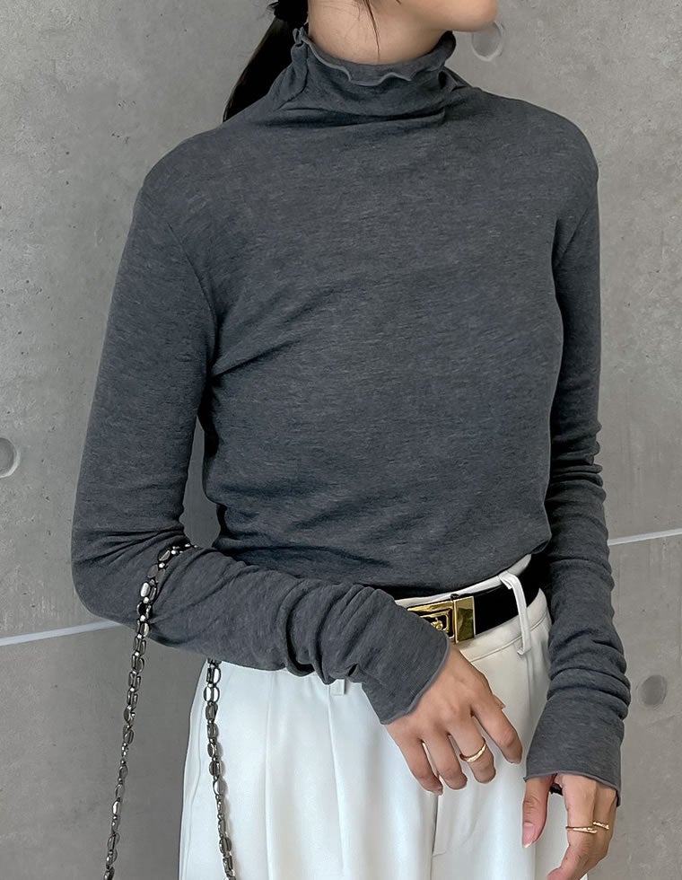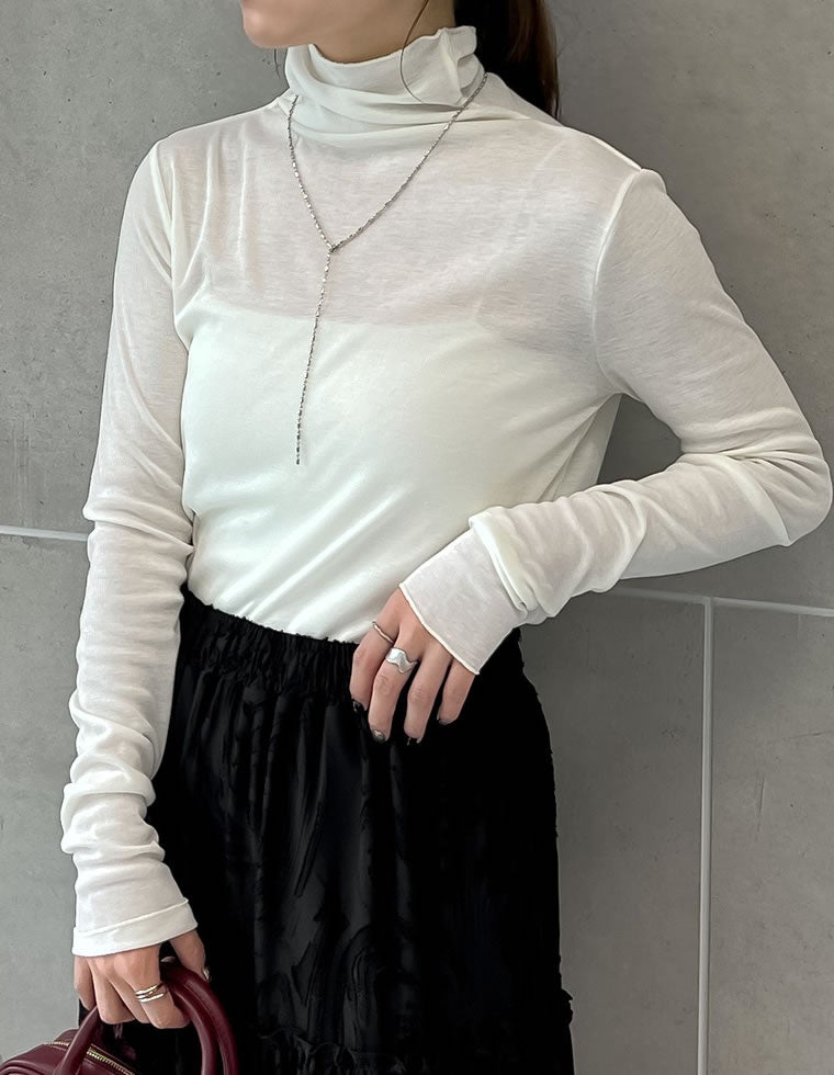 シアー感のある薄手のフライス生地で仕上げたハイネックトップス。