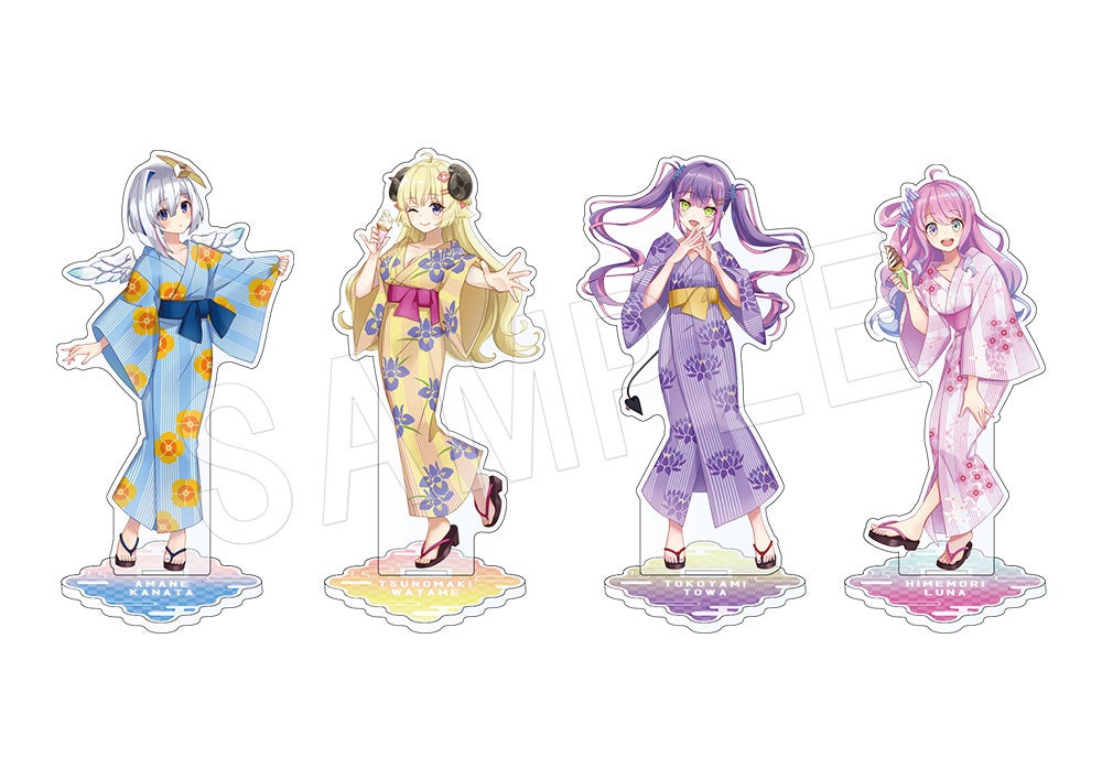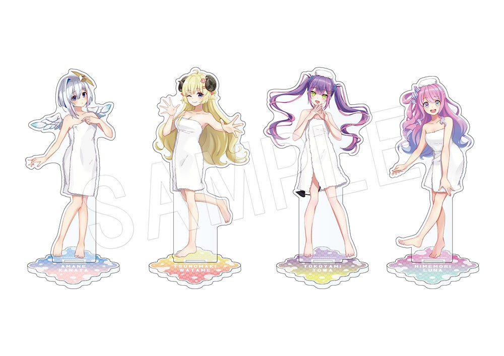 本コラボには「ホロライブ」4期生の所属タレントより「天音かなた」「角巻わため」「常闇トワ」「姫森ルーナ」が参加いたします。ホロライブ4期生の浴衣&フロあがり姿の描き下ろしイラストを使用した「等身アクリルスタンド」や「ブロマイド入り入浴剤」などの新作グッズも登場します!