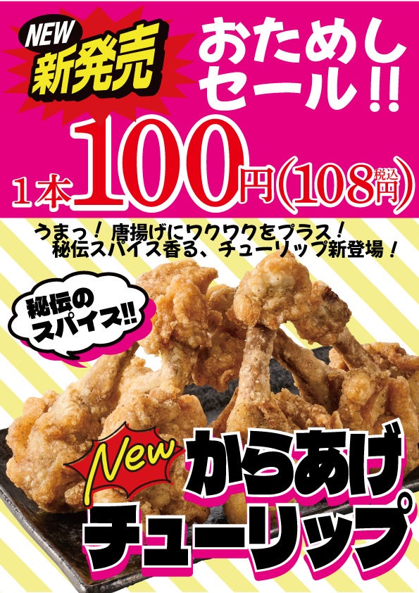 さらに、新商品『からあげチューリップ』発売を記念して通常価格1本158円(税込170円)のところ【おためしセール】1本100円(税込108円)と、お手頃価格でご提供します!