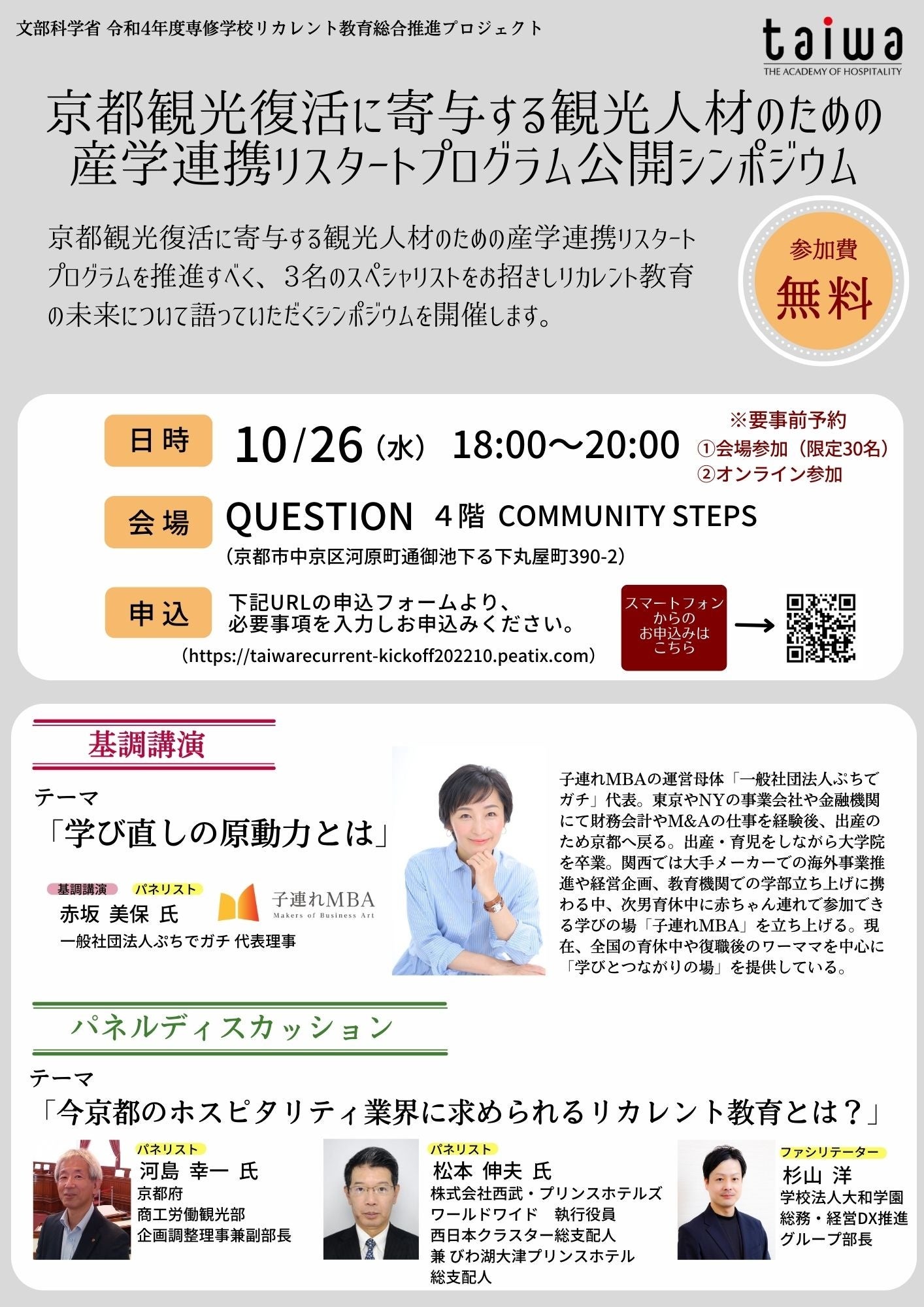 京都観光復活に寄与する観光人材のための産学連携リスタートプログラムを推進すべく、3名のスペシャリストをお招きしリカレント教育の未来について語っていただくシンポジウムを開催します。