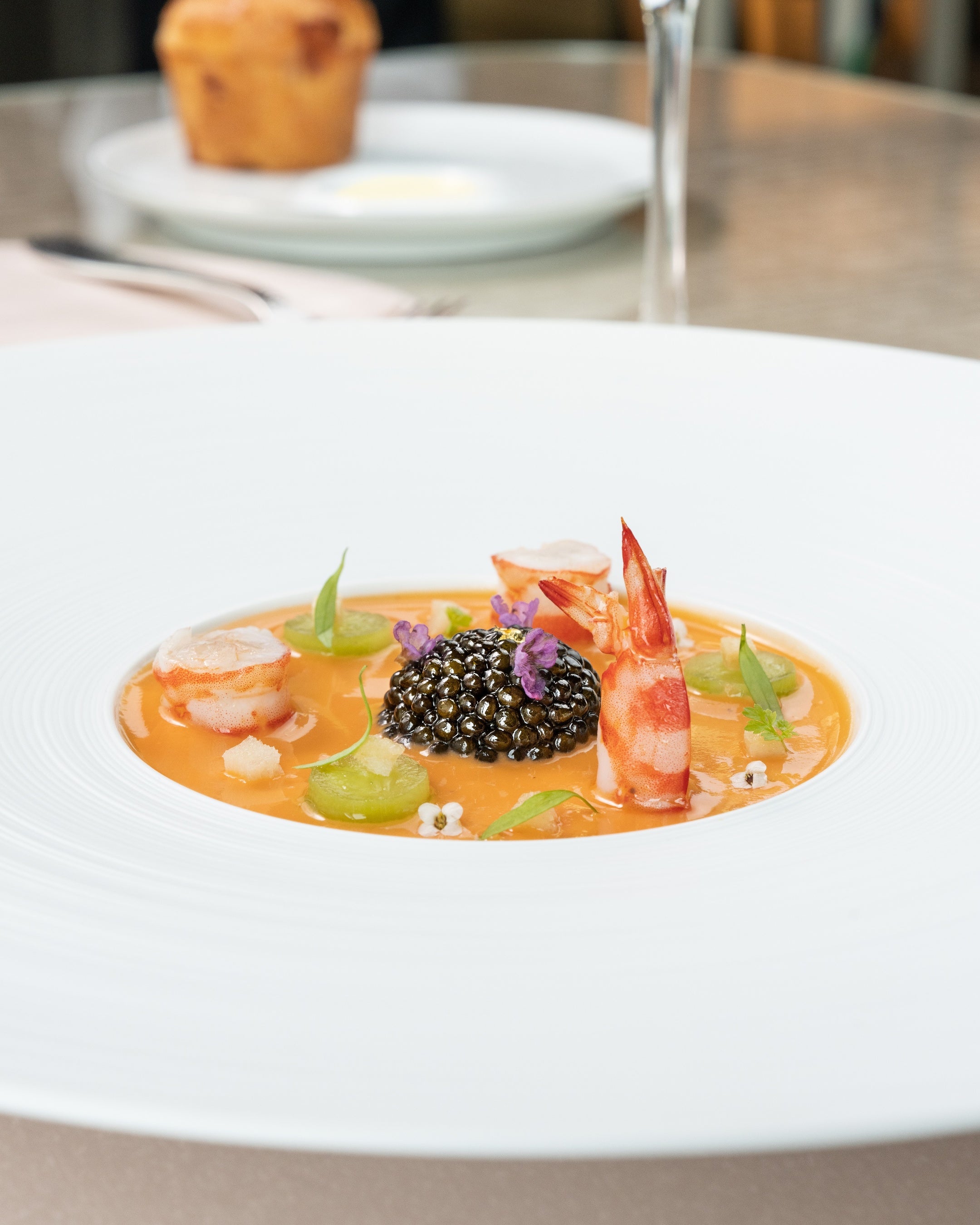 美しく繊細な盛り付けにまずは驚く一皿。フルーツトマトのガスパチョに、車海老とキャビアを合わせて。魚介とトマトの旨味を存分にお楽しみいただける料理です。マリネした胡瓜やクルトンがアクセント。