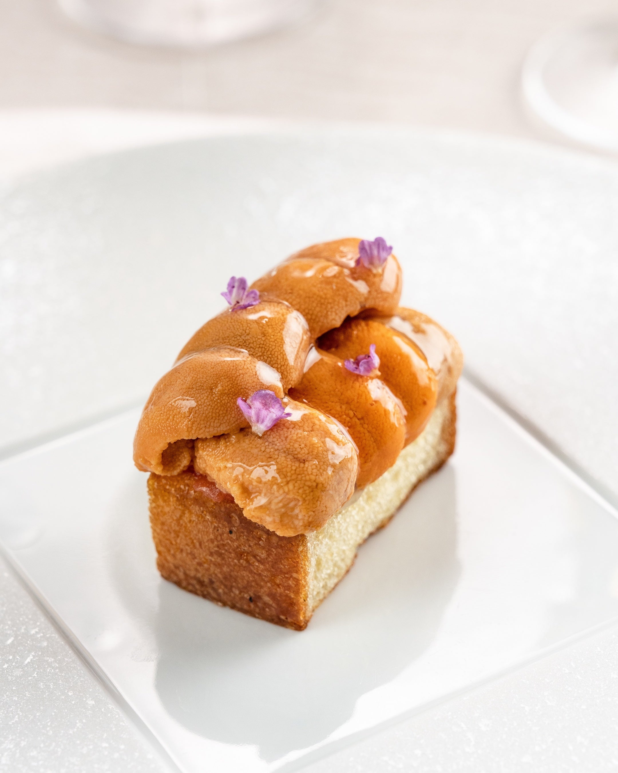 相性の良いトマトと雲丹で“パン・コン・トマテ”をイメージした遊び心あふれる一皿。香り高い自家製ブリオッシュと濃厚な北海道産バフンウニのリッチな味わいに、バフンウニに纏わせたトマトウォーターの爽やかな余韻が続きます。