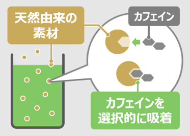 ・当社では、茶葉からではなく、茶抽出液からカフェインを吸着除去する技術に着目し、カフェインを選択的に吸着する天然由来の素材を見出し、「カフェイン除去」と「おいしさ」という2つの価値を両立する「カフェインクリア製法」を確立しました。