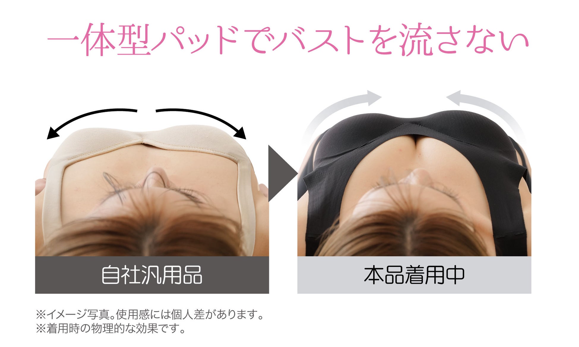 左右一体型パッドだから睡眠中に横へ流れがちなバストもしっかりホールドしてくれて、自然な形でバストラインをキープします。