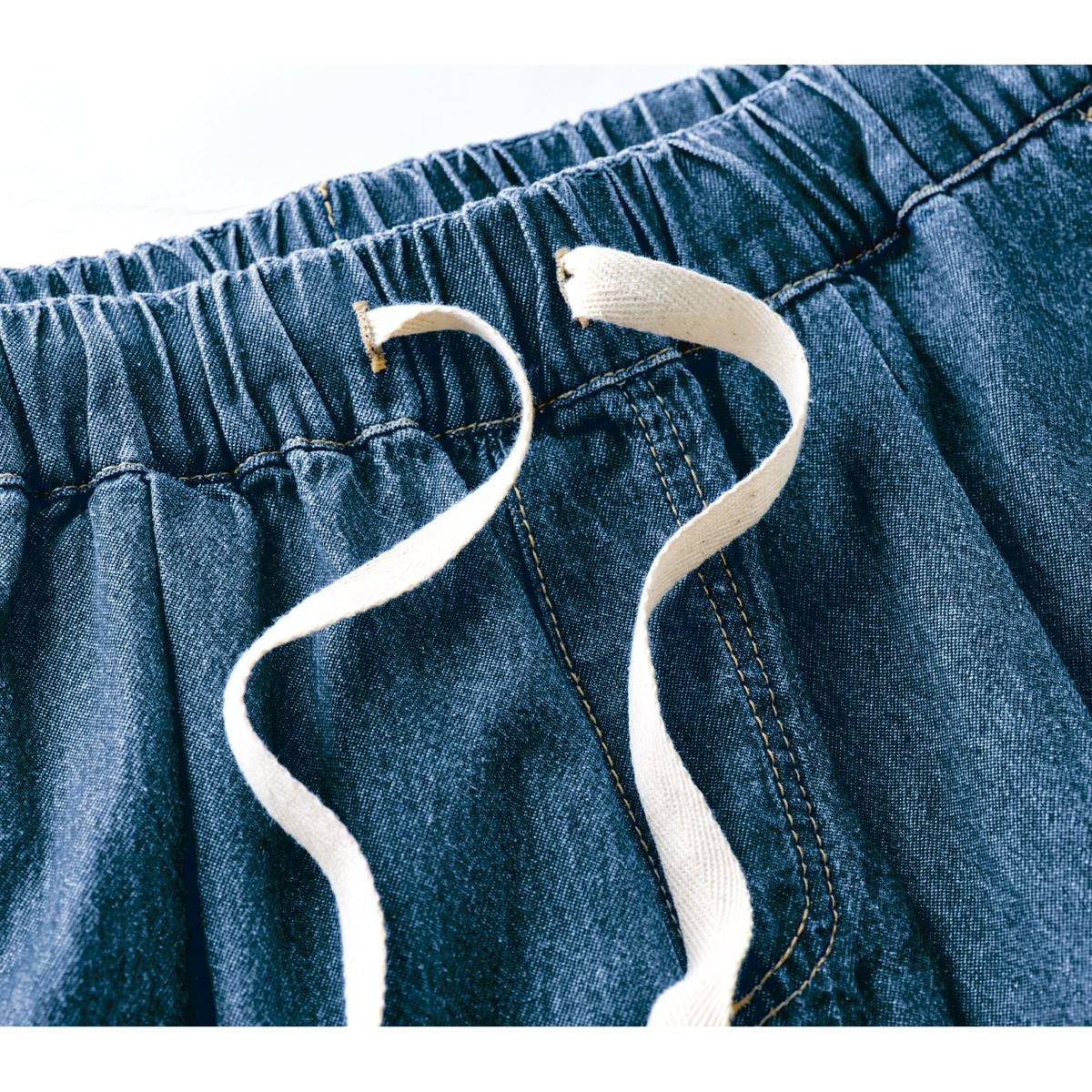 ヒップや太ももをカバーしつつ、トレンド感のある立体的なモードスタイルを演出。体型カバーと脚長効果の両立が叶います。ウエストは総ゴムなのでラクチン。脚のラインを拾いにくいゆったりとしたコクーンシルエットがかわいい♪夏でも軽やかにはける薄手のデニム素材を使用しています。