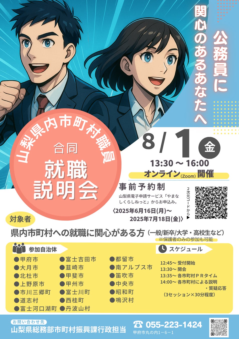 山梨県(知事:長崎 幸太郎)では、県内の市町村で働くことに興味のある皆さまを対象に、「市町村職員合同就職説明会」を令和7年8月1日に開催します。県内20市町村が参加し、各自治体の魅力や仕事内容について直接話を聞ける貴重な機会です。地域に貢献したい方、地元で働きたい方—社会人・大学生・高校生の皆さんのご参加を心よりお待ちしています!