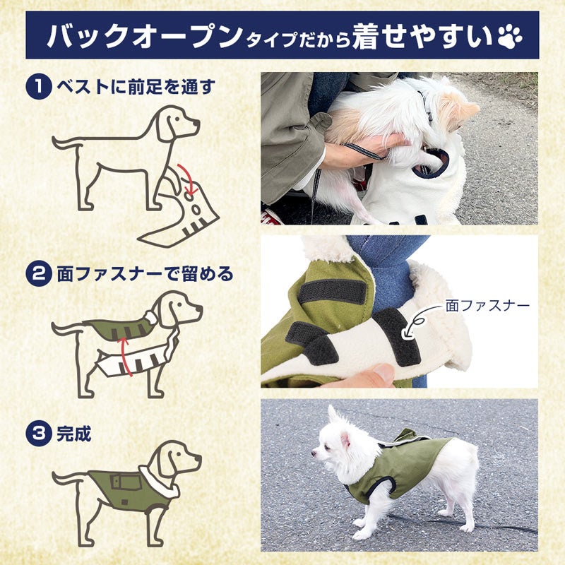 頭を通さずに背中の面ファスナーで留めるだけの「バックオープンタイプ」なので、洋服が苦手なワンちゃんにも着せやすい設計です。