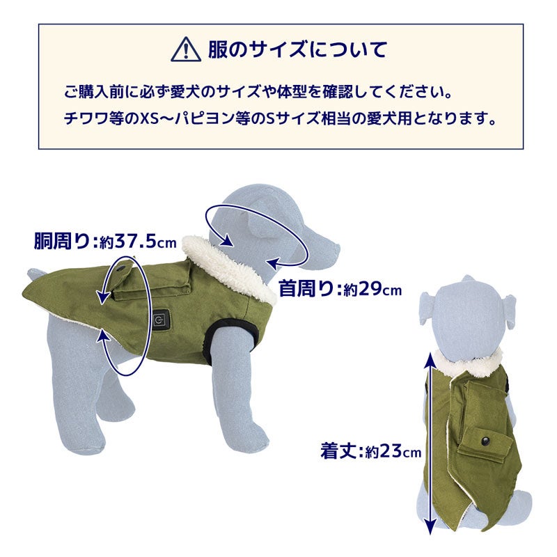 サイズは着丈23cm、首周り29cm、胴周り37.5cmで、一般的なペット服のXS〜Sサイズ相当。
