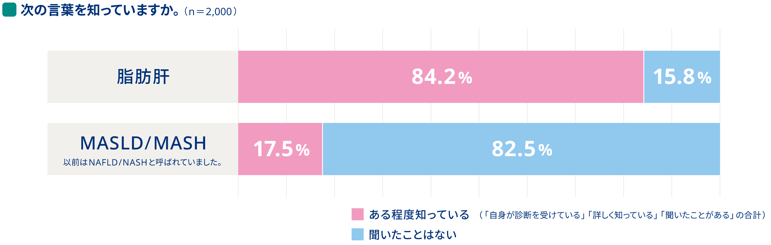 MASLD/MASHの認知度 (約17.5%) は、脂肪肝の認知度 (約84.2%) の約5分の1と低いことが明らかになりました。 (図1)