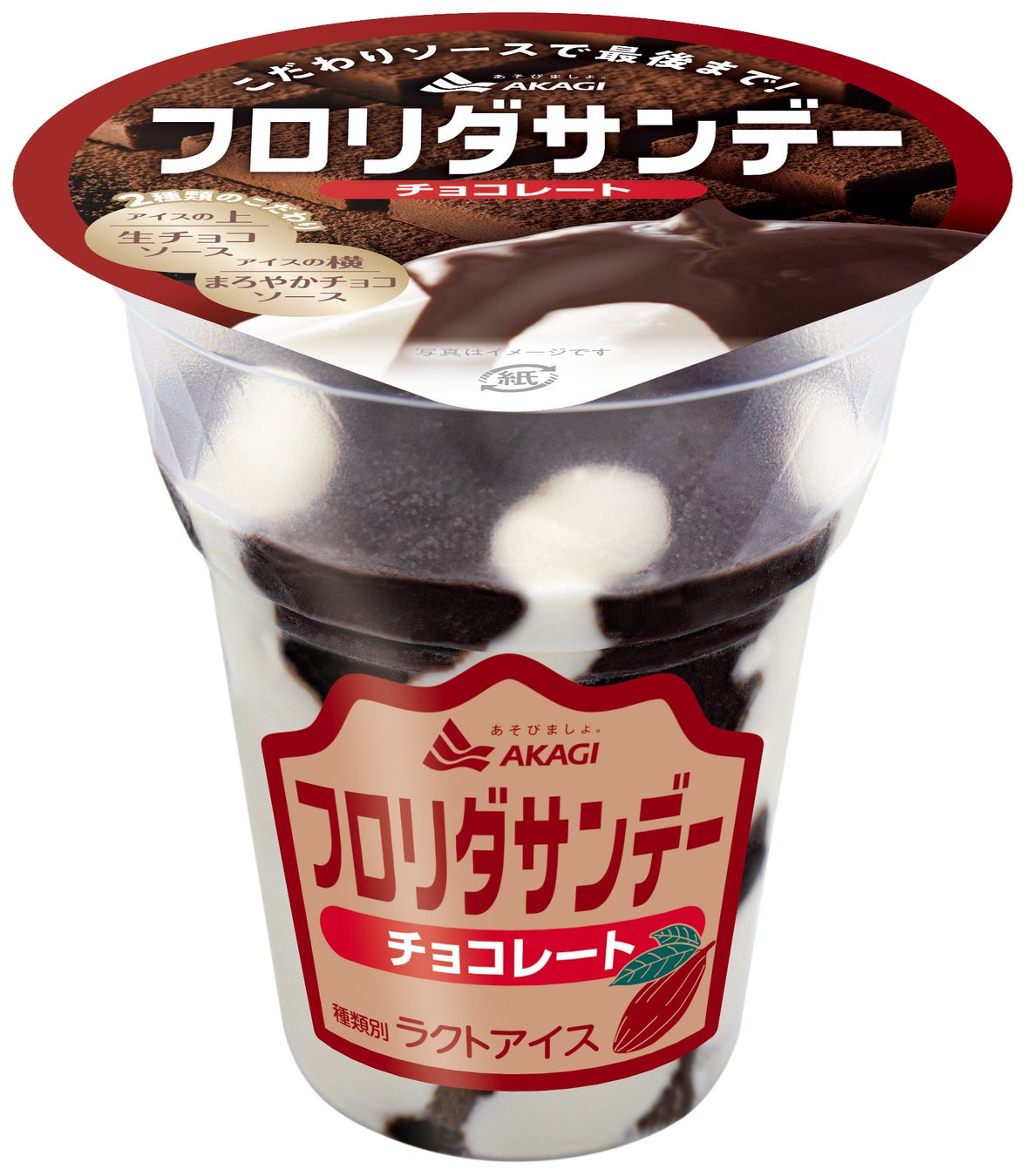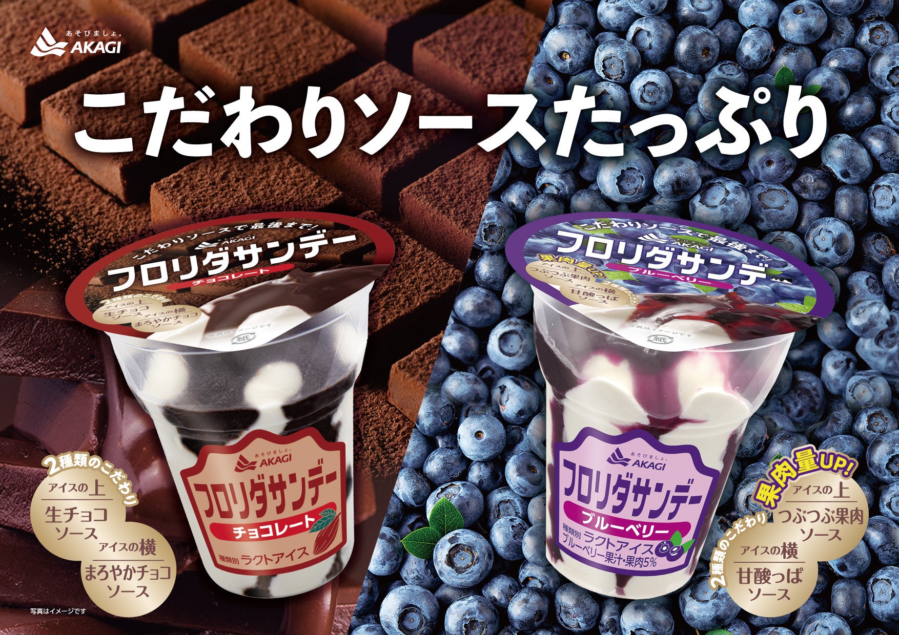 「フロリダサンデー」は、1980年代に発売していた商品の復刻版で、たっぷり入ったソースとアイスが特徴のサンデーアイスです。たっぷりのミルクアイスを最後まで楽しめるように、天面と側面で異なるオリジナルソースを使用しています。チョコレートは生クリームを10%配合した生チョコソースを天面に使用、ブルーベリーは、つぶつぶとした食感を残した果肉入りソースを使用し、ひとくち目から濃厚で満足感を感じられるように工夫しています。