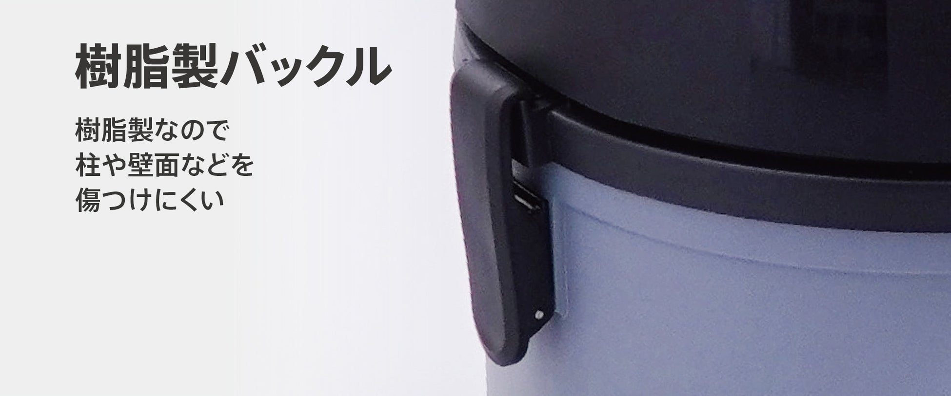 従来のステンレス製タンクは保護シートを使用していましたが、剥がしにくいという声が寄せられていました。新製品ではタンクを樹脂に変更し、保護シートを廃止。さらに、柔らかい樹脂素材により、柱や壁面などを傷つけにくくしました。