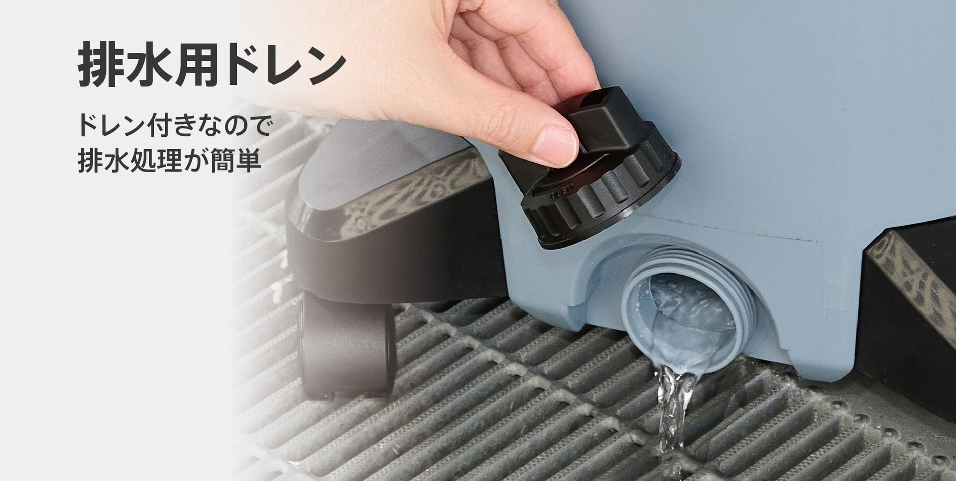 タンクの底を持ち上げる必要があった従来モデルから、新製品ではドレンプラグを新たに設置。これにより、掃除後の排水処理がスムーズになり、排水しやすくなりました。