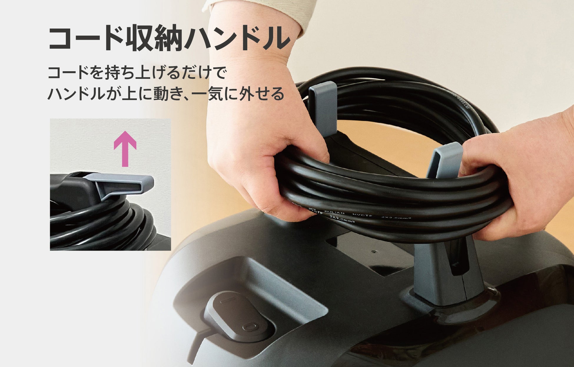 お客様から「電源コードが収納しにくい」という声をいただいていました。そこで、タンクの蓋にコード収納ハンドルを新たに設置。ハンドルは上下に動く設計のため、コードを持ち上げるだけで一度に外すことが可能になりました。これにより、毎回の煩わしい作業が簡単になります。