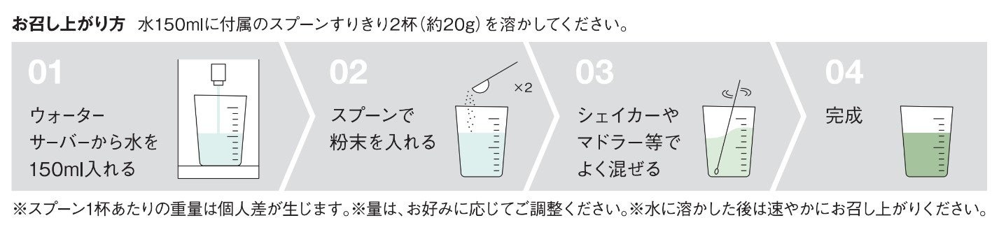 水に溶けやすい酵母プロテインを使用し、ケールはキューサイ独自の「マイルドパウダー製法」で溶けやすくなめらかにした粉末を配合しています。ウォーターサーバーからグラスに水を注いで、付属のスプーン2杯(約20g)を入れて混ぜるだけで、手軽にサッと飲めるようにしました。夏は冷たい水で、冬はお湯に溶かしてホットドリンクにしても美味しくお召し上がりいただけます。