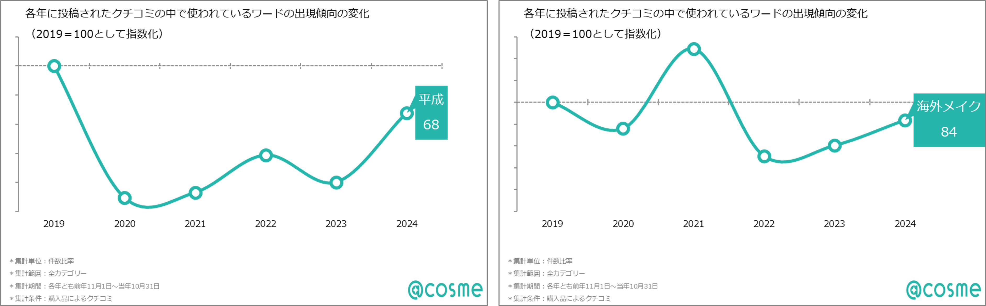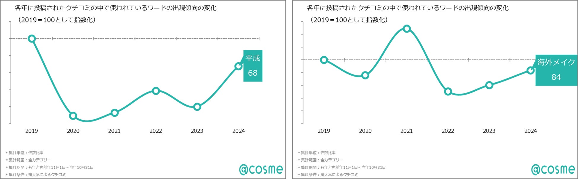 クチコミをみてみると、数は少ないながらも「盛り」傾向のメイクを連想させる「平成」「海外メイク」といったワードの出現率がそれぞれ、昨対3.4倍、1,4倍と増加傾向にあります。