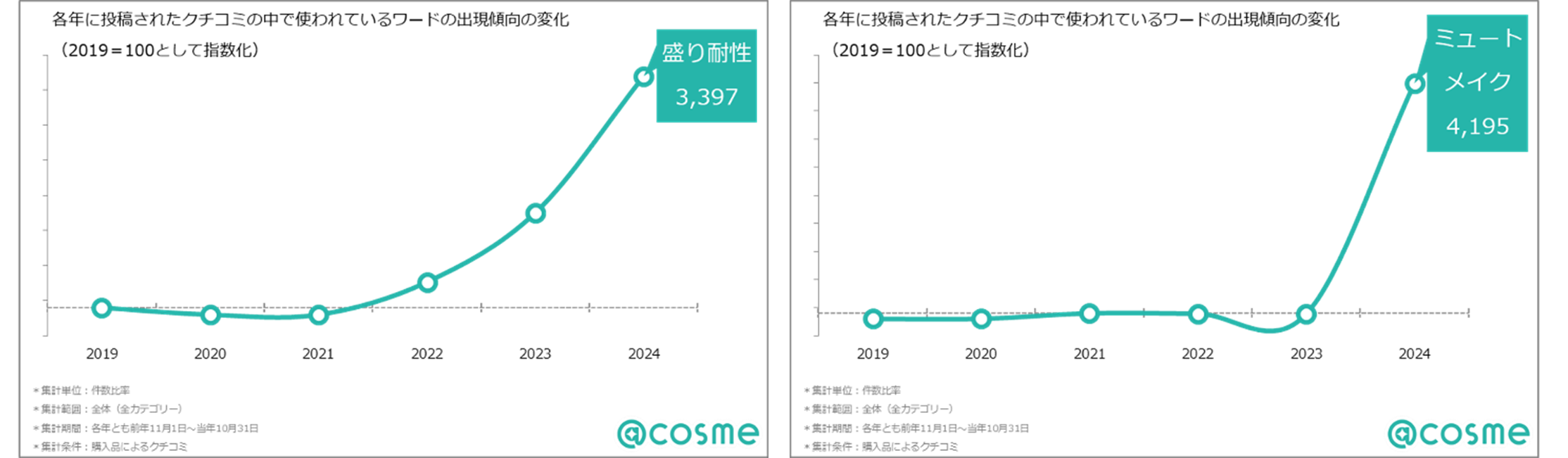 今年トレンドとなり、クチコミにおけるワードの出現率が昨対なんと48.9倍にもなった「ミュートメイク」は、まさに「盛り耐性なしタイプ」の人が安心して取り入れられるメイク方法として話題となり、ミュートメイクで使いやすい「締め色のない淡めカラーのアイシャドウパレット」や「淡い色味のチーク」などが人気を集め、ベストコスメも受賞しました。