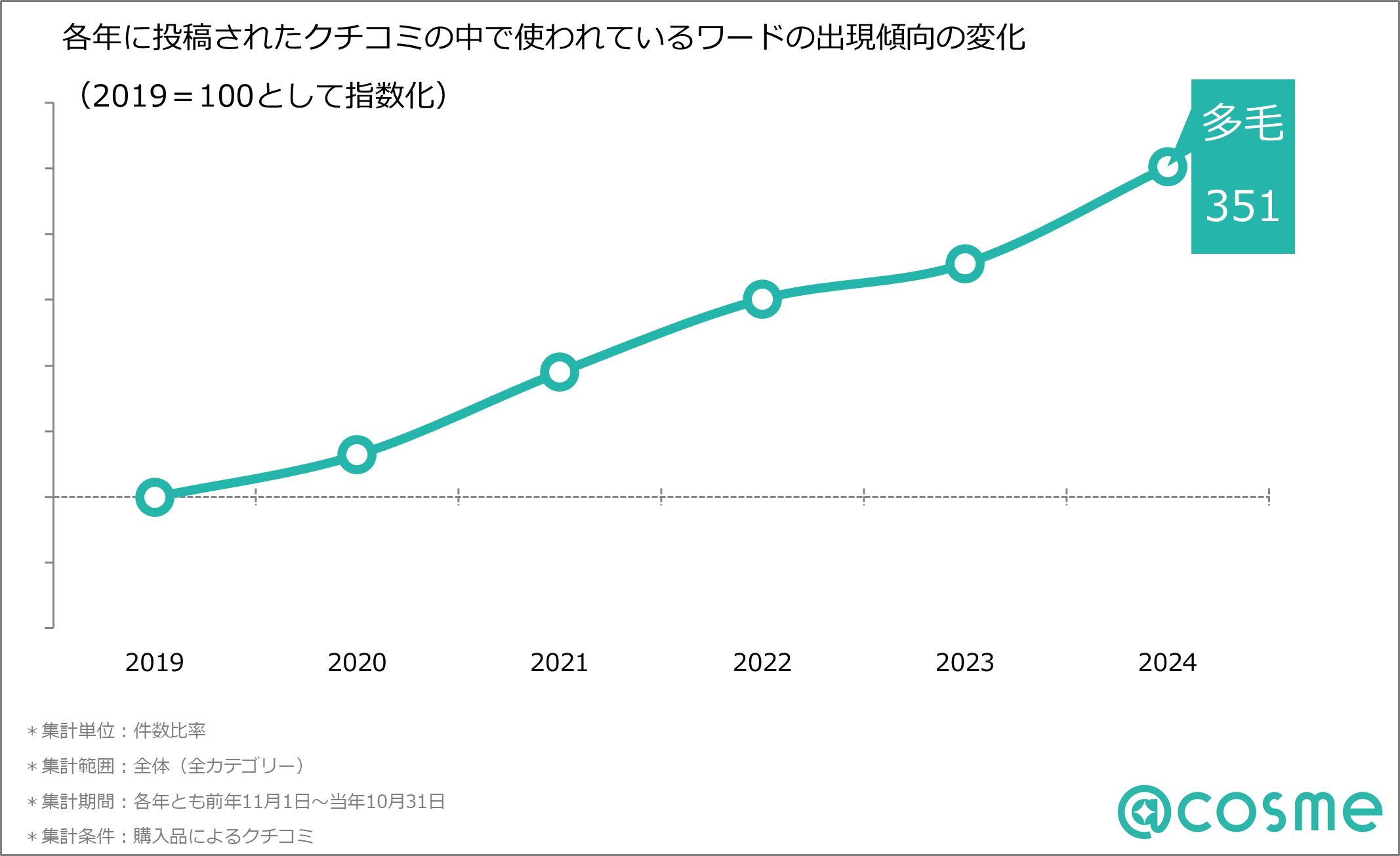 加えて、前述の通り、「多毛」というワードの出現率が昨対1.3倍に増加しています。多毛のお悩みは暑さや湿気による髪の広がりなど、高温多湿な気候と結びつきが強いことから、今後「多毛ケア」はより大きなニーズとなっていくのではないでしょうか。