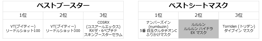その一方で、ベストブースターとベストシートマスクというプラスワンアイテムのカテゴリでは、それぞれTOP3すべてと、2商品で韓国ブランドがランクインしました。