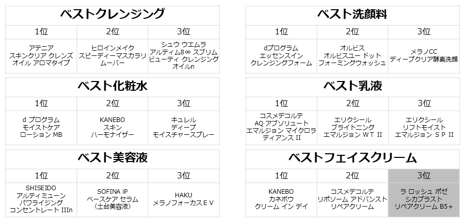 人気商品をアイテム別に表彰する「カテゴリ賞」のラインナップをみてみるとベストクレンジング・ベスト洗顔料・ベスト化粧水・ベスト乳液・ベスト美容液・ベストフェイスクリームというベーシックなスキンケアアイテムでは、6カテゴリ18商品のうち、17商品と9割以上が中価格帯中心の国産ブランドとなり、2024年上半期のベストコスメと同様の傾向となりました。
