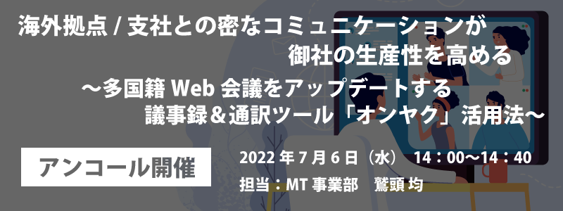 AI自動翻訳のロゼッタ ウェビナー『海外拠点/支社との密なコミュニケーションが御社の生産性を高める ~多国籍Web会議をアップデートする議事録&通訳ツール「オンヤク」活用法~』7月6日(水) 開催