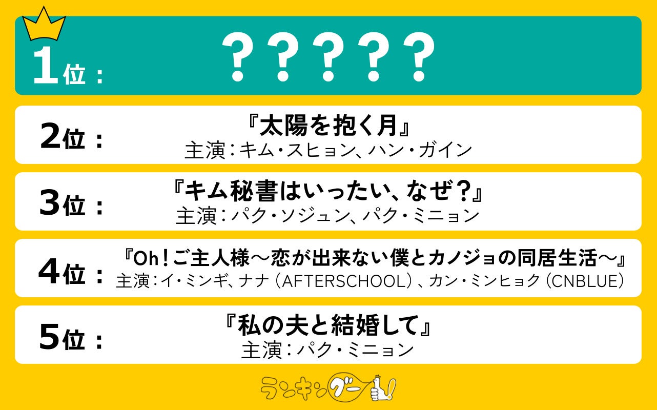 1位は世代を超えて韓流ファンを虜にする名作時代劇の『宮廷女官チャングムの誓い』に決定!2位は韓国で最高視聴率46.1%の人気作、『太陽を抱く月』。3位はウブな大人の胸キュンロマンスの『キム秘書はいったい、なぜ?』。4位は同棲から始まるロマンスを描いた作品『Oh!ご主人様~恋が出来ない僕とカノジョの同居生活~』。そして5位はWebマンガ原作のファンタジー復讐劇『私の夫と結婚して』という結果となりました!