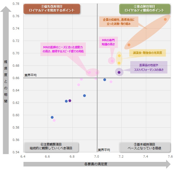 業界全体では、企業の信頼性や患者視点に立った活動・取り組みに加え、講演会や勉強会の充実度、MRの専門知識の高さがロイヤルティを醸成する要因となりました。一方で、MRのスピード感ある対応や、医師のニーズに合った提案力の高さにおいては今後の改善が期待される結果となりました。