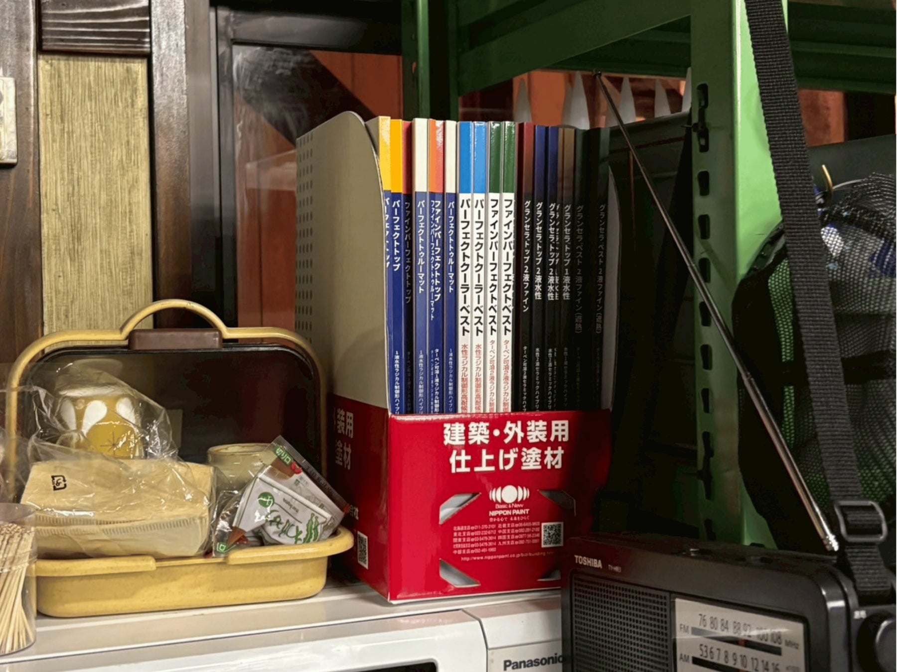 本ドラマの主人公の高木将(たかき しょう)が実家の塗装店「高木塗装」(以下、同塗装店)の3代目社長として登場することから、同塗装店のガレージ制作に美術協力いたしました。同塗装店が建築物への塗装を手掛けていることから、当社は建築用の塗料、塗料缶、色見本帳、カタログ、GOOD JOB保証の登録施工店証、及びオリジナルのノベルティグッズなどを提供いたしました。上記の提供物は実際にプロの現場でも使用されており、同塗装店のガレージにリアルな世界観を演出しています。