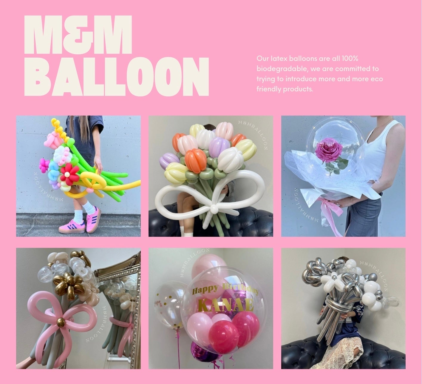 雑誌やテレビなどメディア様への撮影協力・バルーン提供、タレント様への誕生日祝い、楽屋バルーン、クランクアップ時の贈答品、アパレルブランドなどのpopupイベントでの設営やノベルティの制作、ライブやコンサートへのお祝いバルーンスタンドの設置回収までの作業を中心に行う。またサスティナブルにも配慮しており、使用しているゴム風船は100%天然素材の土に還る風船を使用。天然ゴムの需要を通して熱帯雨林の保護や地球温暖化対策に取り組みを行っている。