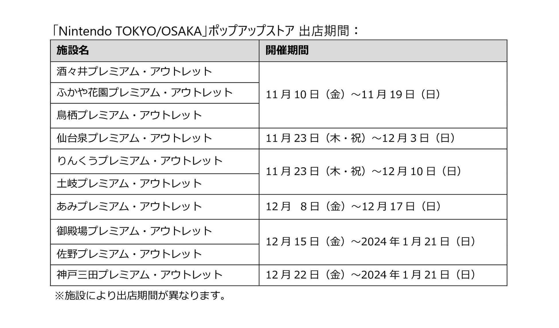 任天堂のオフィシャルストア「Nintendo TOKYO/OSAKA」のポップアップストアが、全国のプレミアム・アウトレットに期間限定で登場します。「スーパーマリオ」「スプラトゥーン」「どうぶつの森」「ゼルダの伝説」など人気のゲームシリーズのグッズや、「Nintendo TOKYO/OSAKA」などの店頭でしか買えない商品の一部も販売予定です。