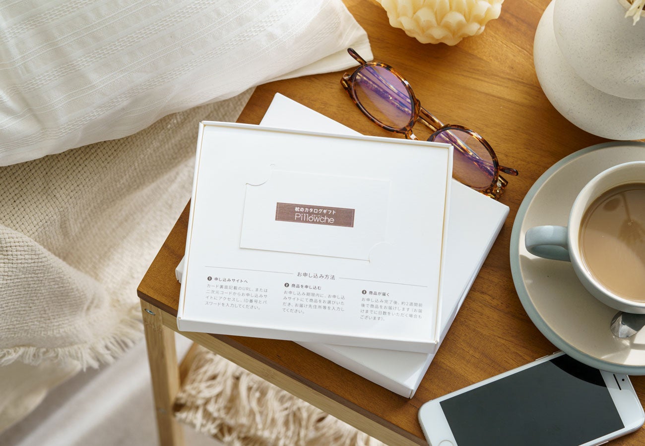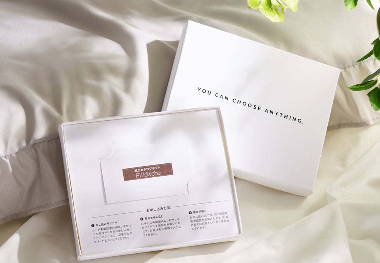 「Pillowche カードタイプ」は、人気の枕94種類を掲載した、枕に特化したオンラインのギフトカタログ。ギフトを受け取った人が自分でオンライン上のカタログから枕を選ぶことができるので、贈る相手の枕の好みが分からなくても安心してギフトを贈ることができます。